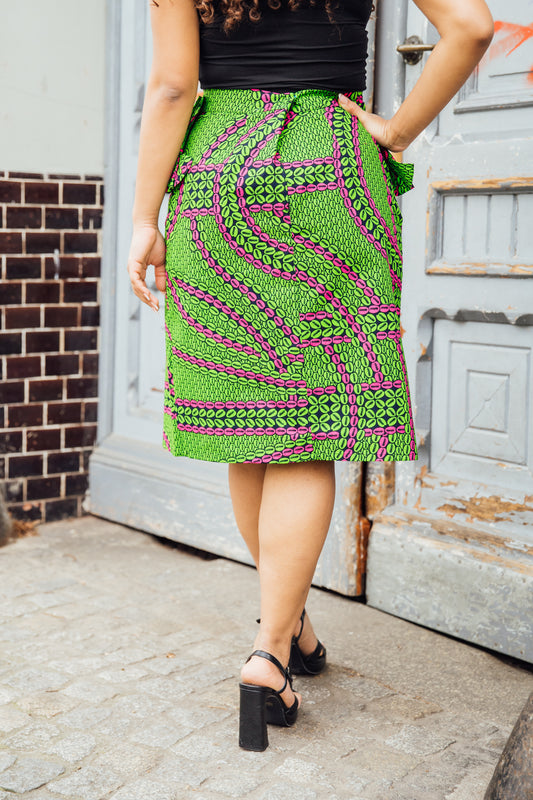 Grün-pinker Midirock mit Schleifen an den Taschen