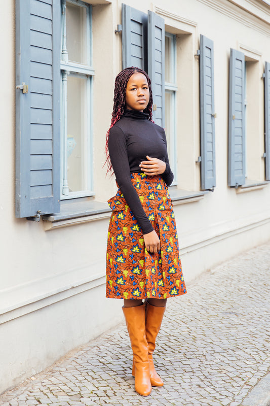 Brauner Midirock mit gelben und blauen Blätter und Schleifen an den Taschen