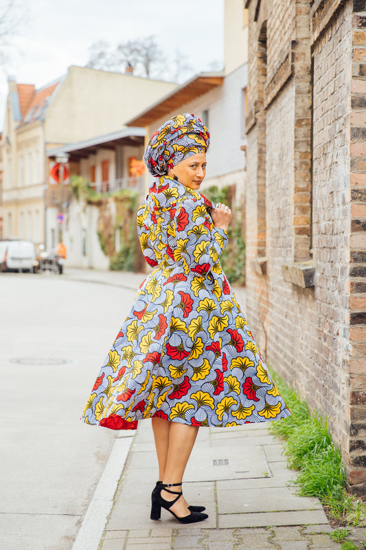 Hoodie-Wickelkleid aus gelb-roten African Print