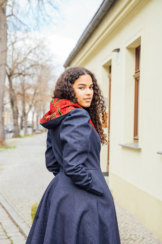 Denim-Hoodie-Wickelkleid mit rotem African Print