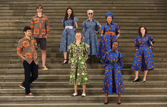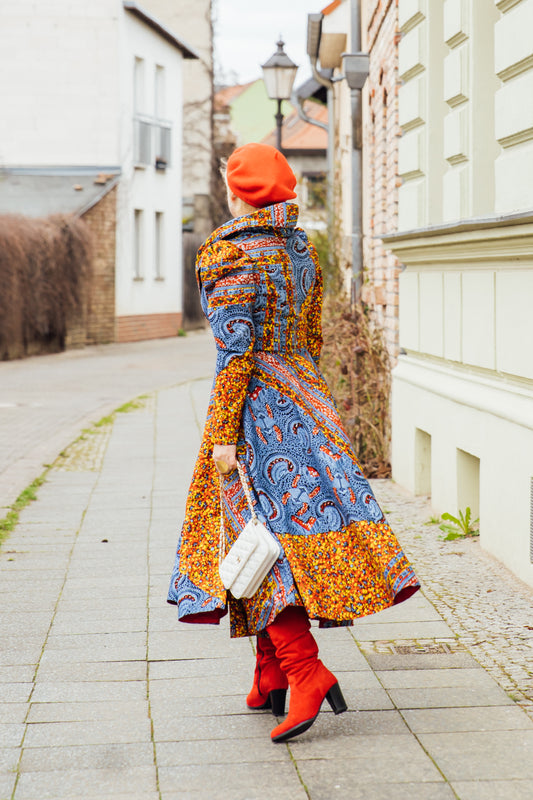 Denim-Sommerkleid mit gold-blauen African Print