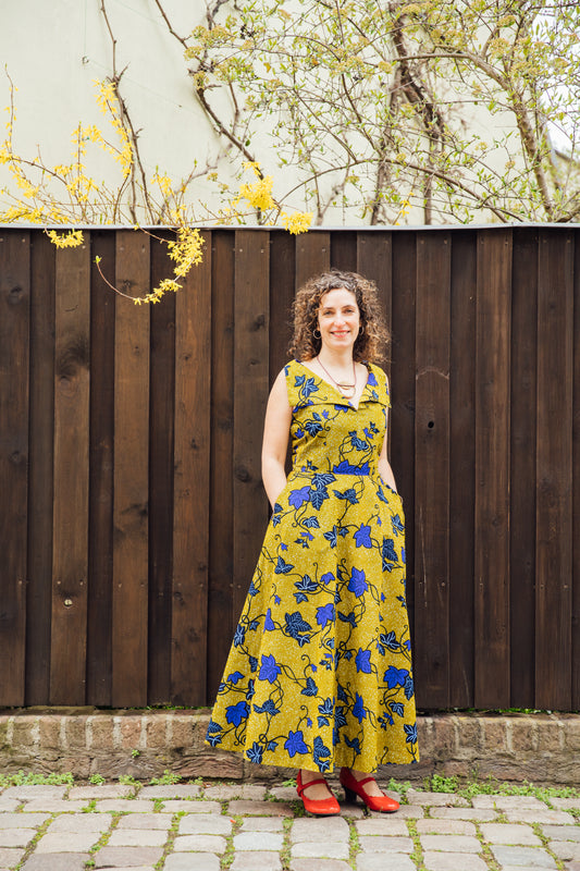 Gelbes Sommerkleid mit blauen Blattmuster